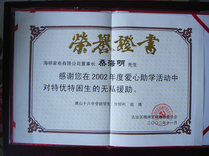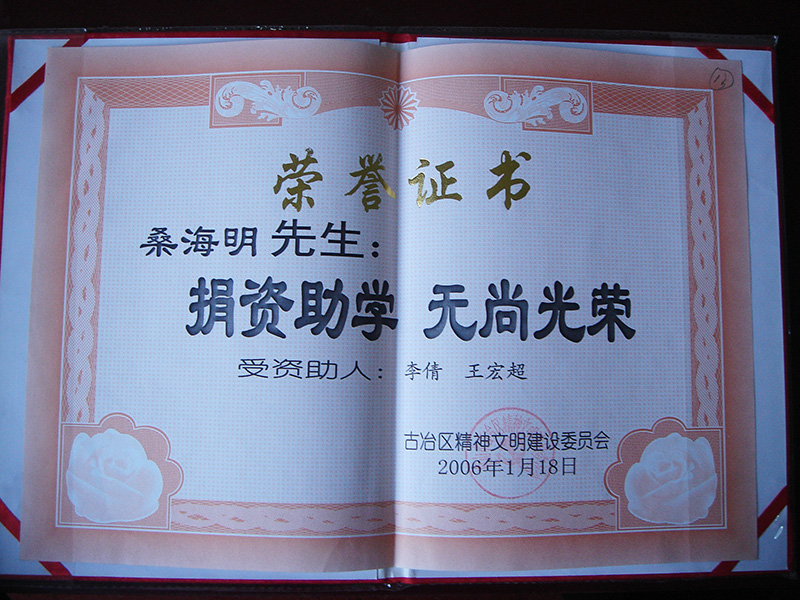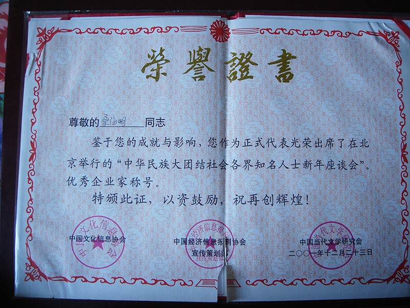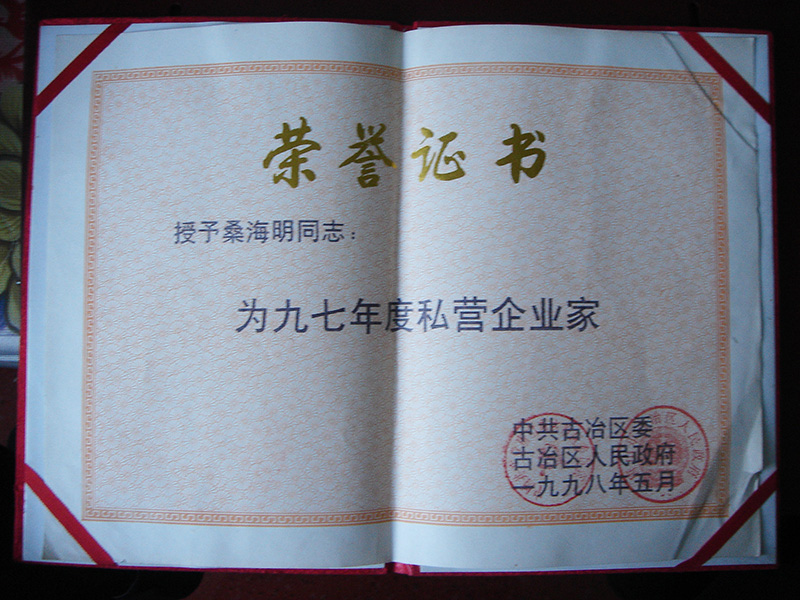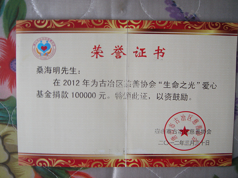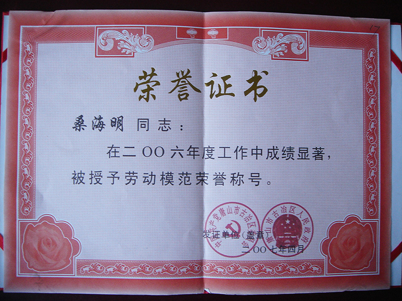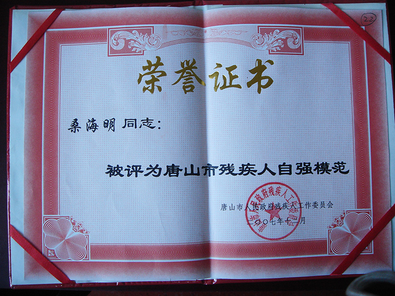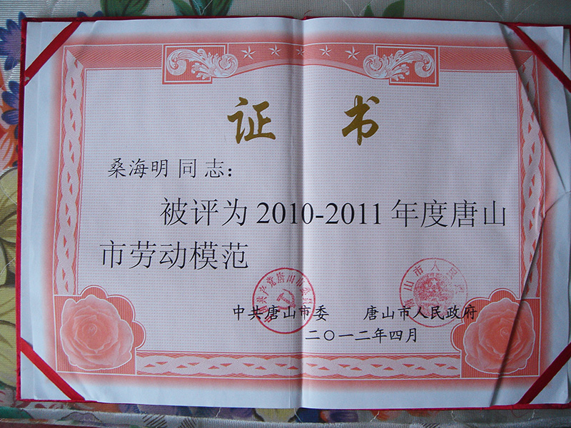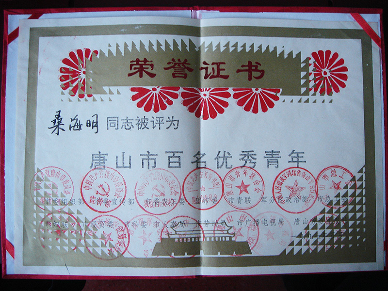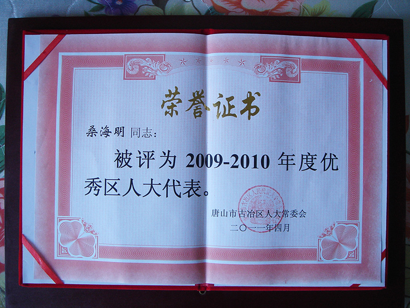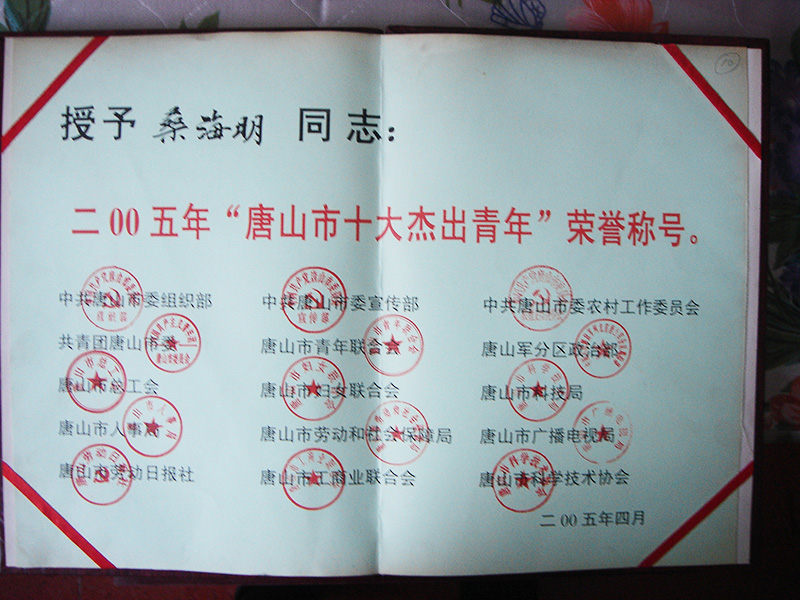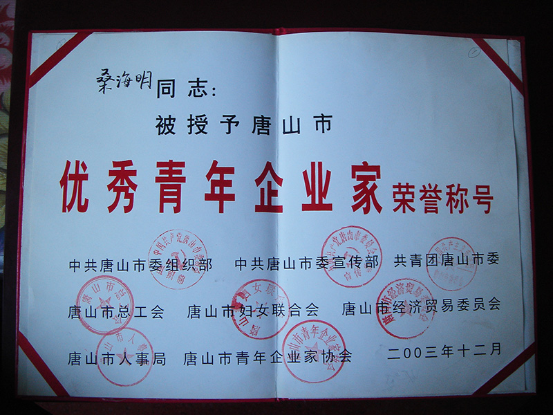 集團董事長桑海明自1988年開始創(chuàng)業(yè)至今已有三十余年的從業(yè)歷程,曾歷任唐山市政協(xié)委員,唐山市青聯(lián)委員,唐山市殘疾人企業(yè)家協(xié)會副會長、古冶區(qū)人大代表、古冶區(qū)殘聯(lián)副主席、古冶商會副會長、古冶區(qū)私營企業(yè)協(xié)會副會長等職務,并多次被授予如下殊榮: